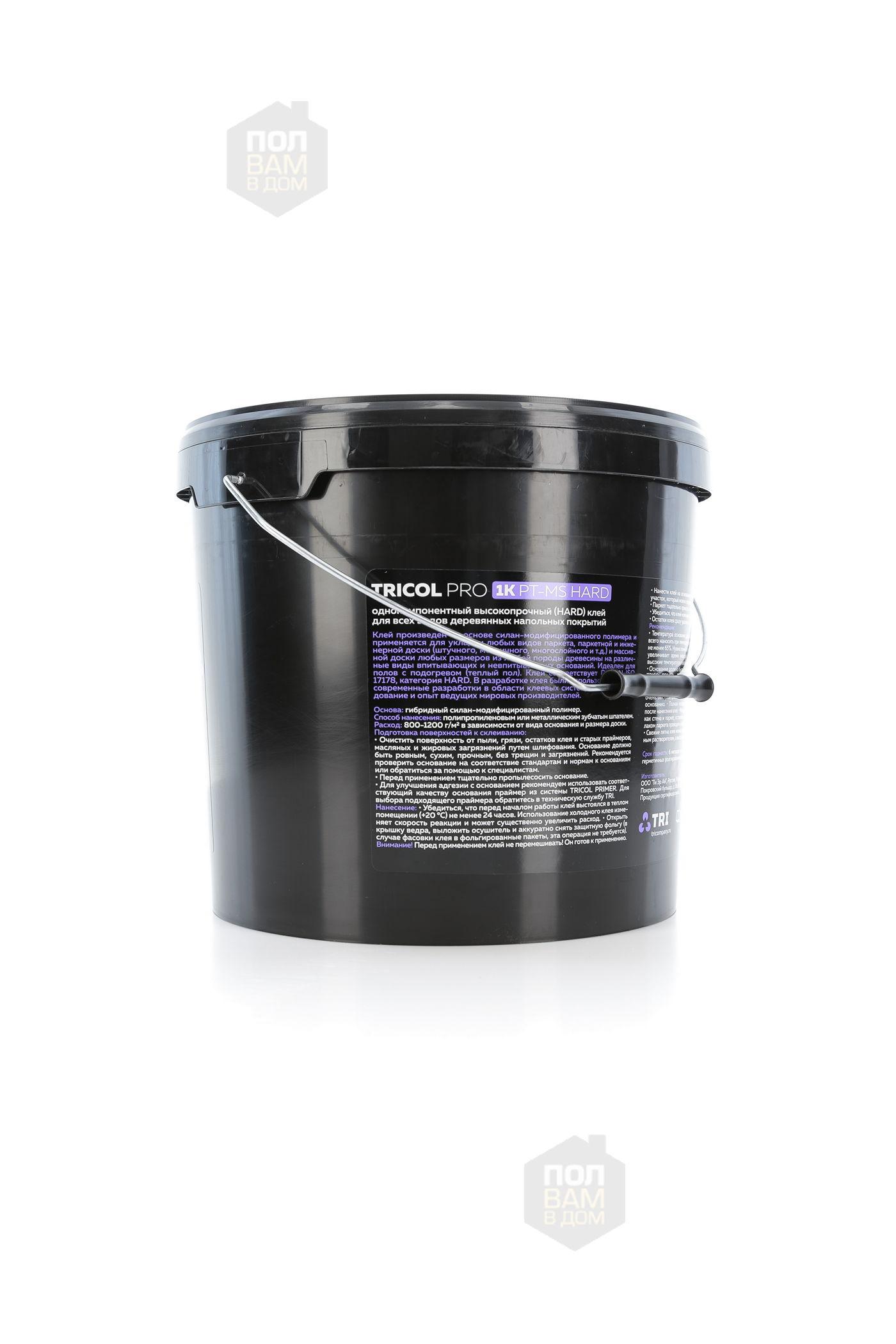 TRICOL PRO 1K PT-MS HARD - Премиальный однокомпонентный высокопрочный (HARD) клей для всех видов деревянных напольных покрытий. Клей произведен на основе силан-модифицированного полимера и применяется для укладки любых видов паркета, паркетной и инженерной доски (штучного, мозаичного, многослойного и т.д.) и массивной доски любых размеров из любой породы древесины на различные виды впитывающих и невпитывающих оснований. Идеален для штучного паркета и экзотических пород древесины. Клей соответствует DIN EN ISO 17178, категория HARD. В разработке клея были использованы самые современные разработки в области клеевых систем, а также оборудование и опыт ведущих мировых производителей.